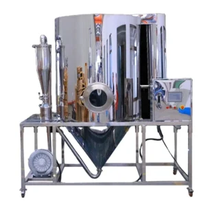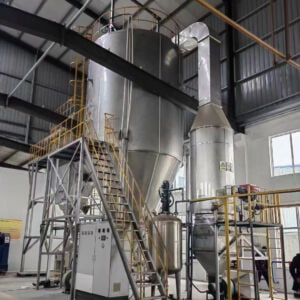 1. Rapid drying speed.The surface area of the material will be enlarged greatly when liquid raw material is atomized and 95% – 98% of water can be evaporated instantly in the hot airflow. The drying time only need to take several seconds. This dryer is especially suitable for heating sen sitive material.